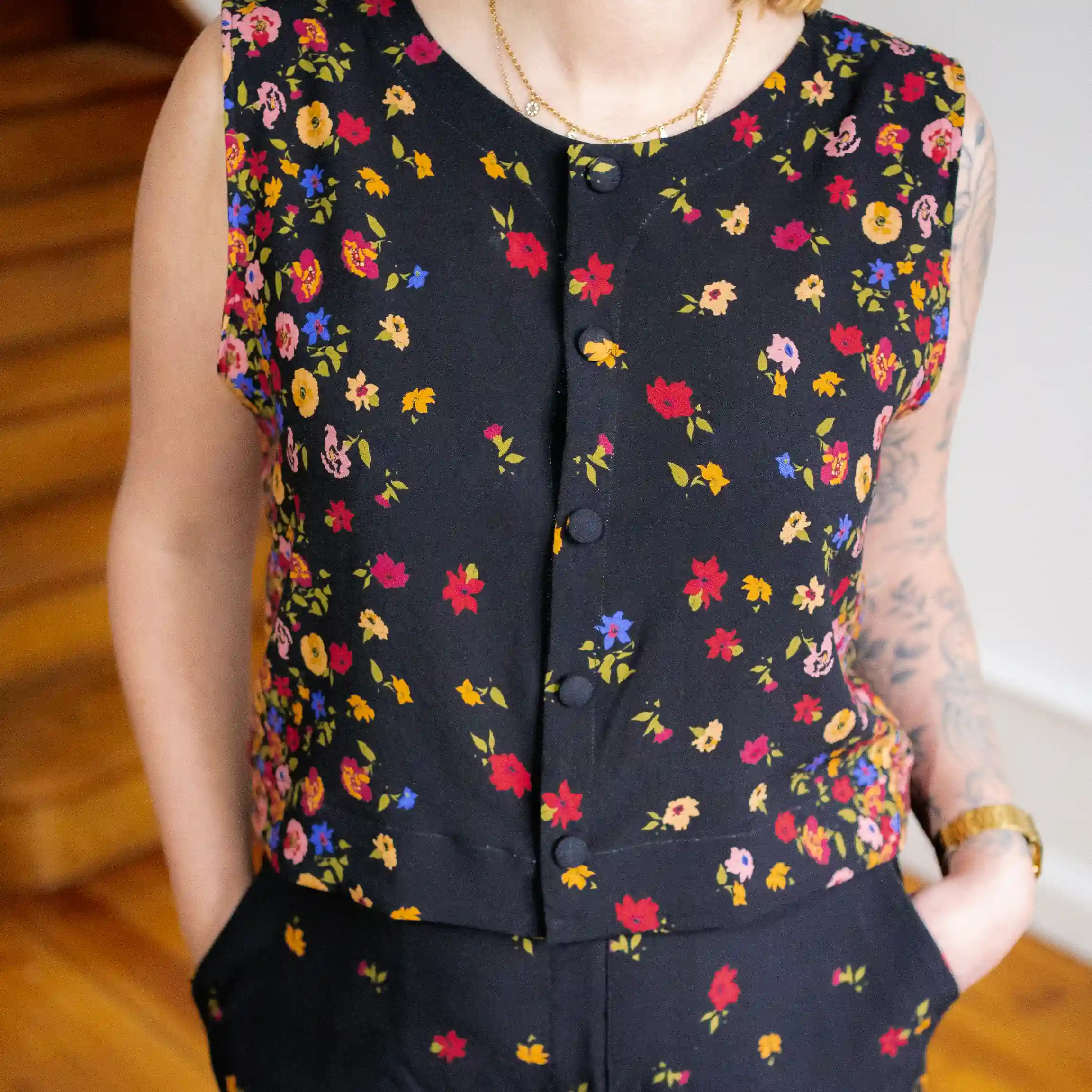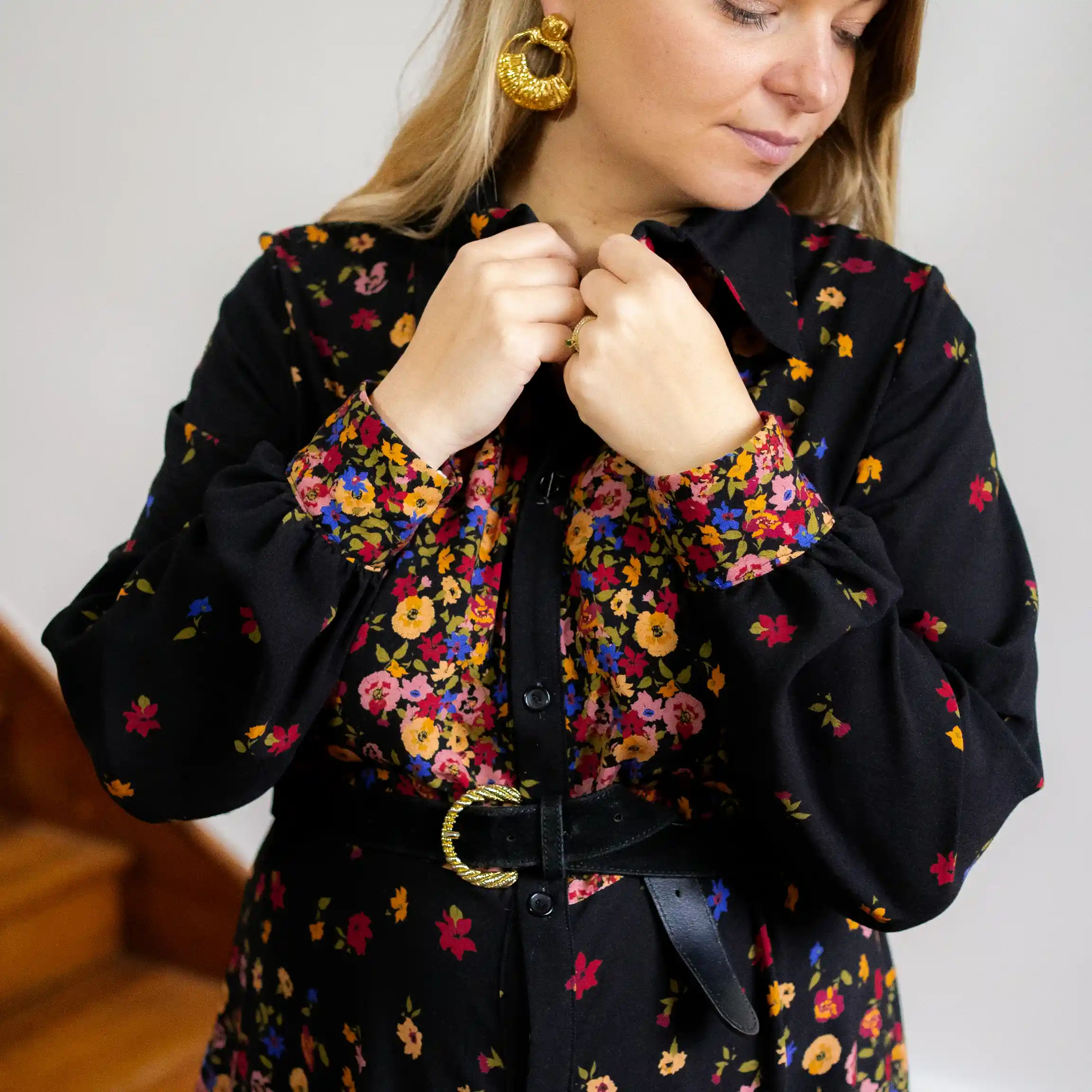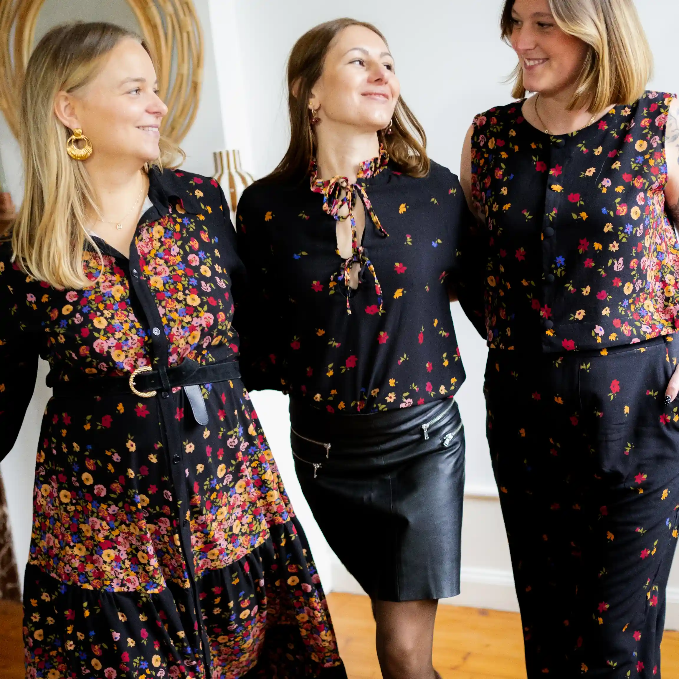 Charline est une viscose certifiée EcoVero et imprimée en France. Sa qualité est fluide et légère sans être trop glissante. Elle pèse 130 g/m2 pour une laize de 140 cm. Le coloris et le motif de Charline sont suffisamment denses pour que vous ne soyez pas obligé(e) de doubler vos coutures ! Aucune des pièces réalisées pour le shooting photo "Les petits bonheurs" n'a été doublée.